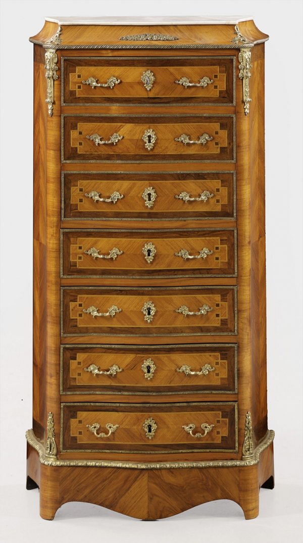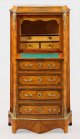 Napoleon III-Secretaire ŕ abbatant Palisander und Rosenholz, furniert. Dreiseitig bombierter Korpus auf passig geschweiftem, profiliertem Zargensockel. In der gegliederten Front vier Schubladen sowie abklappbare Arbeitsfläche mit Blendschubladen. Innen Arbeitsfläche aus Filz sowie Facheinteilung mit Ahornfurnier. Geschweift ansteigende Deckplatte aus weißem Marmor, minim. besch.; Flächendeckend breit gerahmte, gespiegelt angeordnete Furnierfelder. H. 125,5 cm. 66 cm x 34 cm.