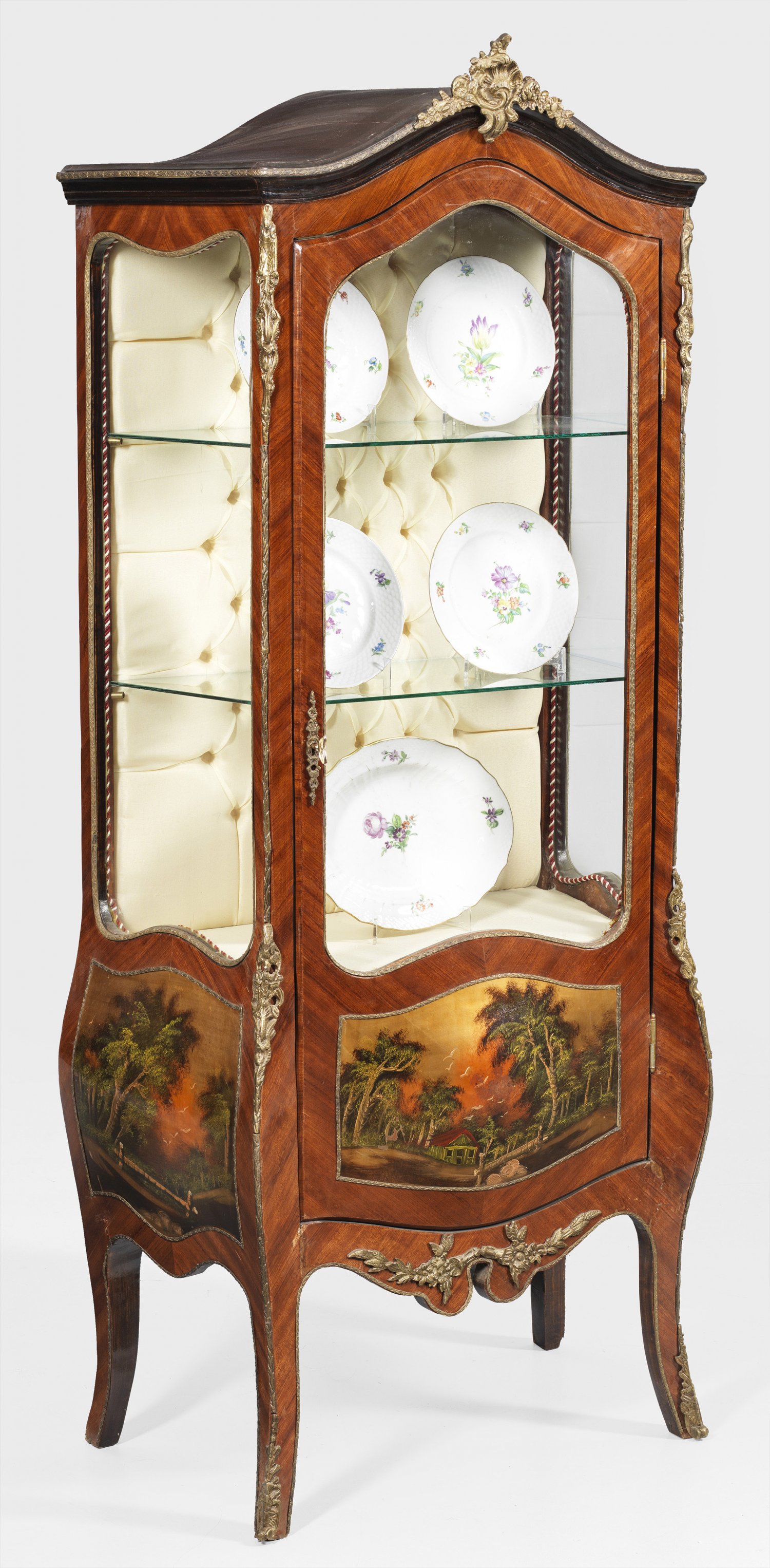 Salonvitrine im Louis XV-Stil Rosenholz furniert sowie polychromer Landschaftsdekor im Vernis Martin-Stil. Dreiseitig verglaster teilw. stark bombierter Korpus flankiert von weit ausgezogenen Ecklisenen in ausgestellte Beine übergehend. Geschweift ansteigender oberer Abschluss mit Blattkartusche. Innen cremefarbene Stoffauskleidung. H. 175 cm. 75 cm x 42 cm.