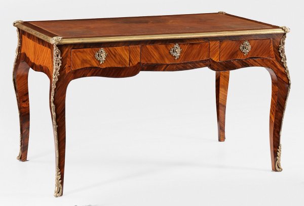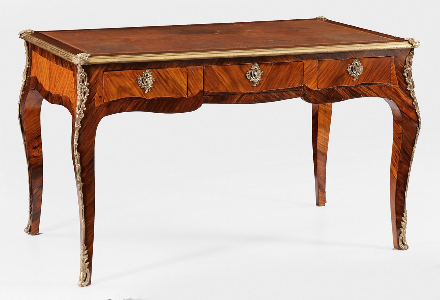 Louis XV-Bureau plat Palisander und Rosenholz furniert. Passig geschweifter Zargenkasten auf leicht geschwungenen Beinen. In der gegliederten Front flaches Kniefach sowie drei Schubladen unterschiedlicher Größe. Korrespondierende umlaufend profilgerahmte Deckplatte mit eingelegter Arbeitsfläche aus braunem Leder. Allseitig gespiegelt angeordnete Furnierfelder von schmalen Fadeneinlagen begrenzt. H. 78 cm. 133 cm x 81 cm.