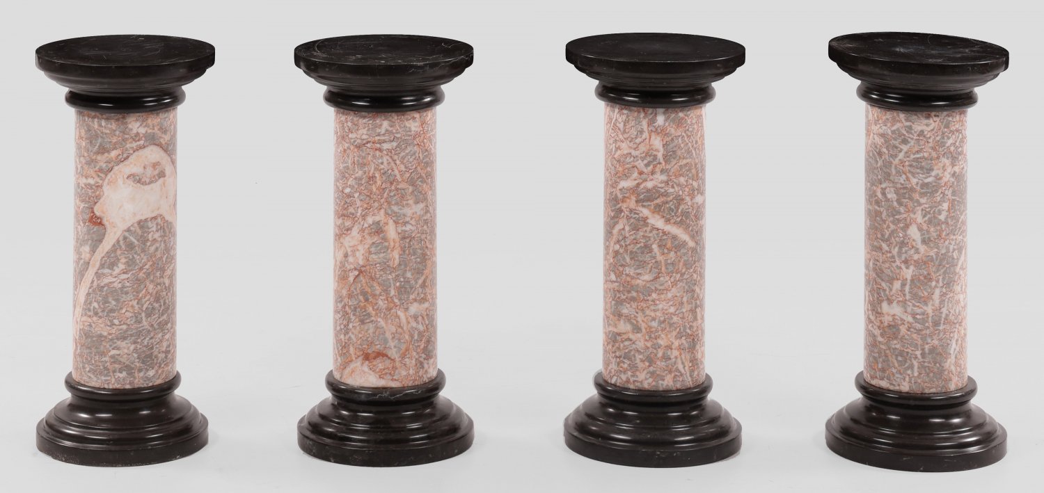Satz von vier kleinen Säulen Hellgrauer roséfarben und weiß gemaserter sowie anthrazitfarbener Marmor. Über gestuft ansteigender profilierter Basis zylinderförmiger Schaft als Träger für korrespondierendes Kapitell. H. 62 cm. D. 27 5 cm.