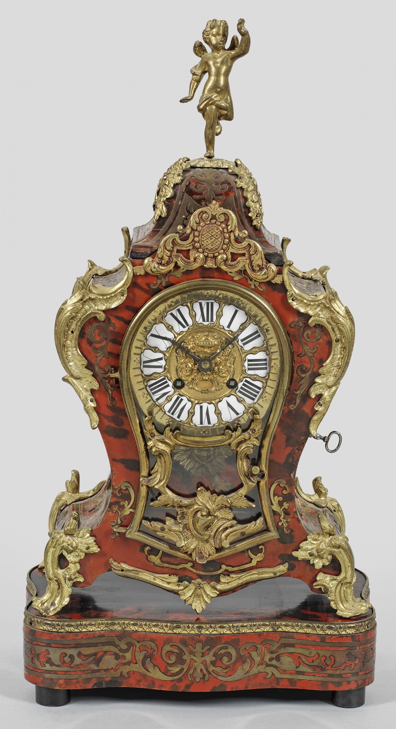 Boulle Pendule im Louis XV-Stil Flächendeckender Fond aus Messing und rot hinterlegtem Horn in sog. Boulle-Technik. Balusterförmiger dreiseitig verglaster Korpus flankiert von Rocaillen mit geschweift ansteigendem oberen Abschluss und Puttenbekrönung. Reliefiertes Zifferblatt mit Emailreserven. Pendulenwerk mit Pendelfeder sowie Halbstundenschlag auf Glocke. Unterhalb korrespondierender Podestsockel. Ges.-H. 48 5 cm. 25 cm x 14 cm.