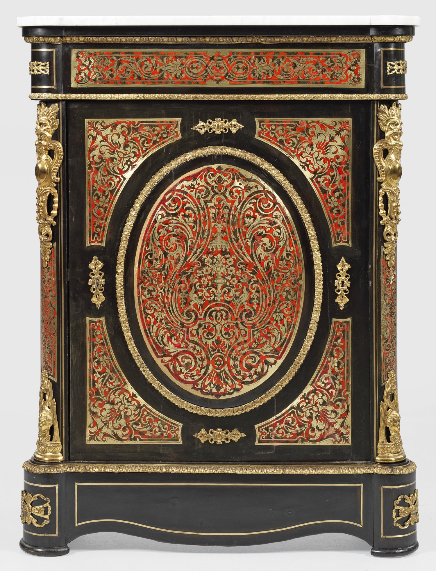 Napoleon III-Boulle Salonschrank Holz ebonisiert sowie reiche Marketerie aus Messing und rot hinterlegtem Lack in sog. Boulle-Technik. Gerader Korpus flankiert von gerundeten Ecklisenen auf geschweiftem Zargensockel. In der gegliederten Front Tür mit leicht vorgewölbtem Medaillon sowie reiche Marketerie aus üppigem Volutenwerk. Korrespondierende Deckplatte aus weißem Marmor. H. 111 cm. 84 cm x 39 5 cm.