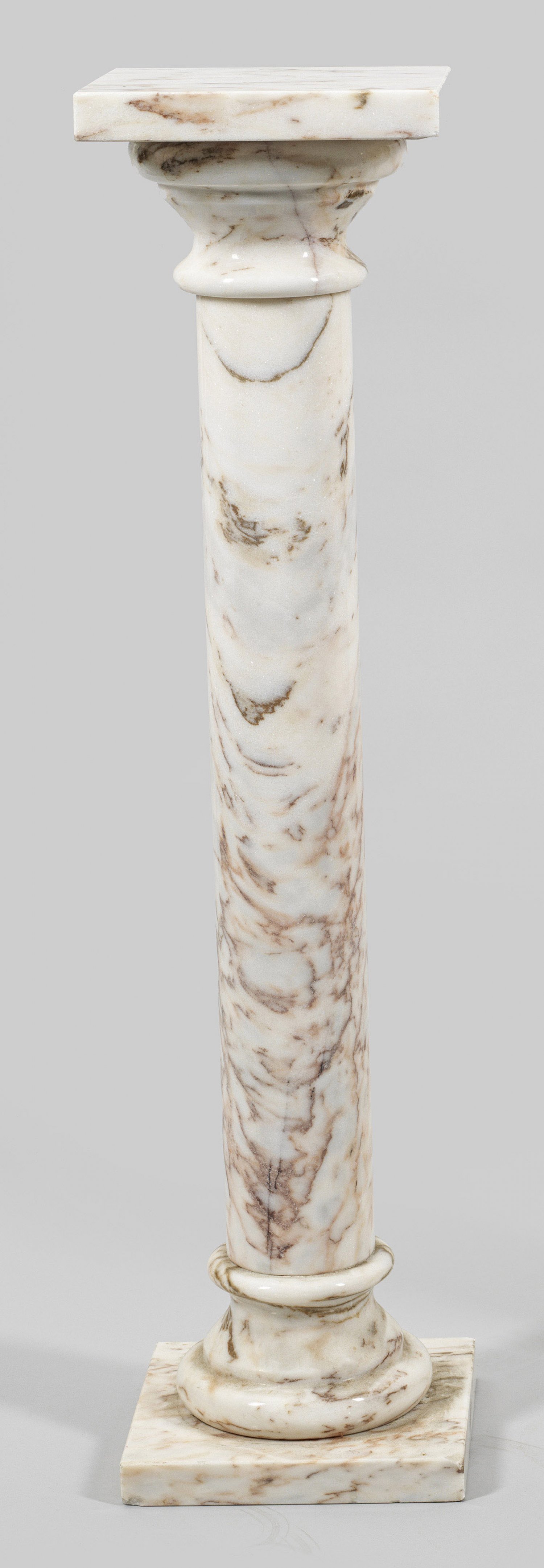 Skulpturensäule Cremefarbener rotbraun gemaserter Marmor. Über quadratischer Sockelplatte und profilierter Basis zylinderförmiger Schaft als Träger für korrespondierendes Kapitell und entsprechende Deckplatte. H. 92 5 cm. 22 5 cm x 22 5 cm.