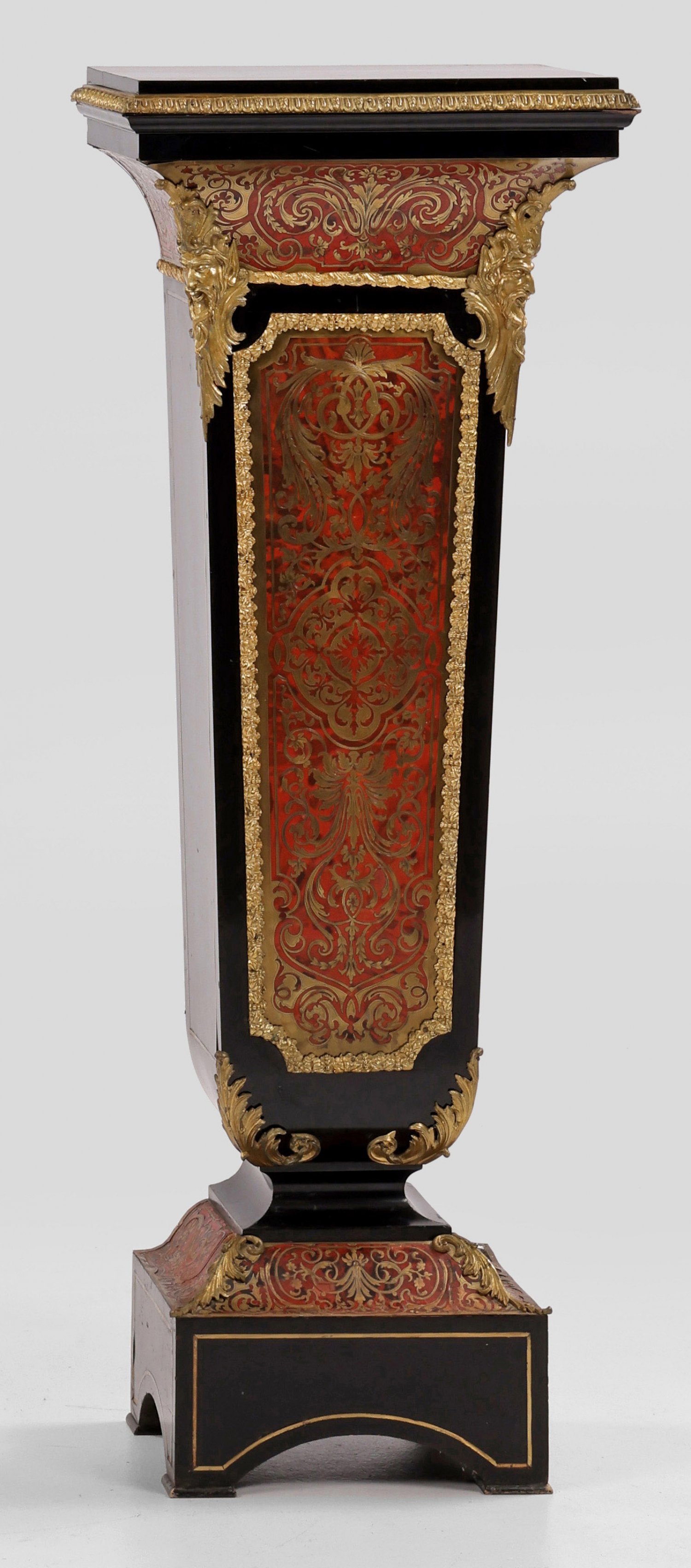 Napoleon III Boulle-Postament Holz ebonisiert sowie flächendeckender Fond aus Messing und rot hinterlegtem Horn in sog. Boulle-Technik. Über gekanteter Basis sich konisch verbreiternder Schaft flankiert von reliefplastisch gestalteten Satyrmaskarons als Träger für rechteckige Deckplatte. Schauseitig große Reserven mit üppigem Volutendekor sowie Applikationen aus vergoldeter Bronze. H. 129 cm. 47 cm x 32 cm.