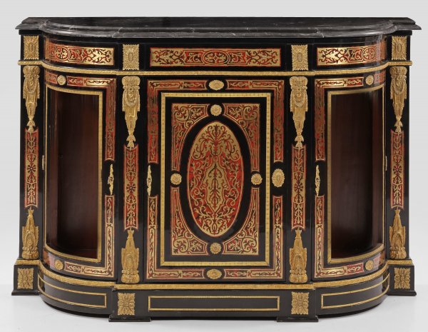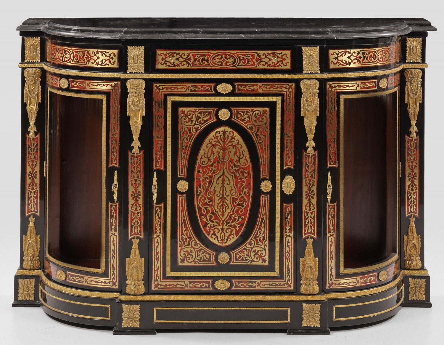 Große Anrichte im Boulle-Stil Holz schwarz lackiert sowie flächendeckende Marketerie aus Messing und rot hinterlegtem Lack in sog. Boulle-Technik. Querrechteckig angelegter Korpus auf gekantetem Sockel. In der gegliederten Front breite Tür und Schubfach flankiert von bombierten Vitrinentüren. Dekorationen aus ornamental angeordneten Volutenmotiven sowie Applikationen aus Bronze. Profilierte Deckplatte aus dunkelgrauem Marmor. H. 104 cm. 154 cm x 53 cm.