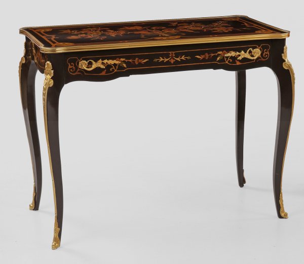 Salontisch im Louis XV-Stil Ebonisiertes Holz furniert sowie Einlagen aus unterschiedlichen gefärbten Edelhölzern. Passig geschweifter einschübiger Zargenkasten auf hohen geschwungenen Beinen. Korrespondierende profilgerahmte Deckplatte. Allseitig reiche Dekorationen aus intarsierten Blütenmotiven von Bandeinlagen begrenzt. H. 78 cm. 100 cm x 57 cm.