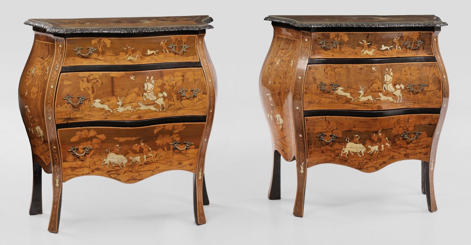 Paar Salonkommoden im Barock-Stil Nussbaum furniert sowie Einlagen aus unterschiedlichen Edelhölzern und Knochen. Dreiseitig bombierter Korpus flankiert von schräggestellten Ecklisenen in ausgestellte Beine übergehend. In der gegliederten Front drei Schubladen unterschiedlicher Größe. Profilierte Deckplatte. Flächendeckend szenisch angelegte Intarsienbilder aus unterschiedlichen Jagddarstellungen. H. 86 cm. 87 cm x 38 cm.