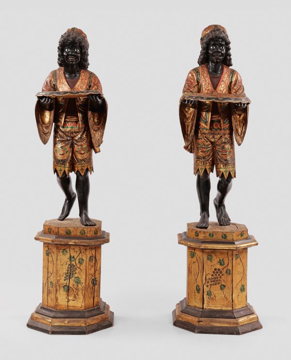 Paar große skulpturale Gueridons Holz geschnitzt polychrom gefasst und teilw. vergoldet. Über oktogonaler Basis und gekantetem Schaft mit Weinreben vollplastische Darstellung von reich gekleideten venezianischen Mohren mit Anbietschalen. H. 182 cm.