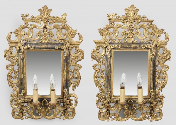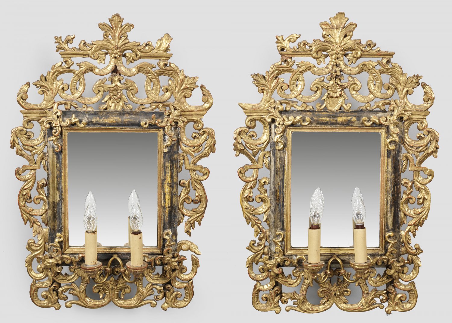 Paar Barock-Spiegelappliken 2-flg.; Holz, geschnitzt, gefasst und vergoldet. Hochrechteckige, profilierte Spiegelrahmung, umgeben von üppigen, durchbrochen gearbeiteten und verschlungen angelegten Volutenmotiven und Blattwerk. Unterhalb davon ausgehend stark geschwungene Leuchterarme mit zylinderförmigen Tüllen. 80 cm x 54 cm.
