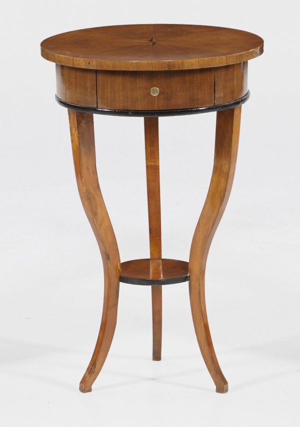 Biedermeier-Trommeltischchen Kirschbaum furniert sowie teilw. ebonisiert. Bombierter einschübiger Zargenkasten auf hohen geschwungenen Beinen unterhalb durch kleines Ablagefach verbunden. Runde Deckplatte mit zentriert angeordneten Furnierfeldern und Sternintarsie. H. 76 cm. D. 48 cm.