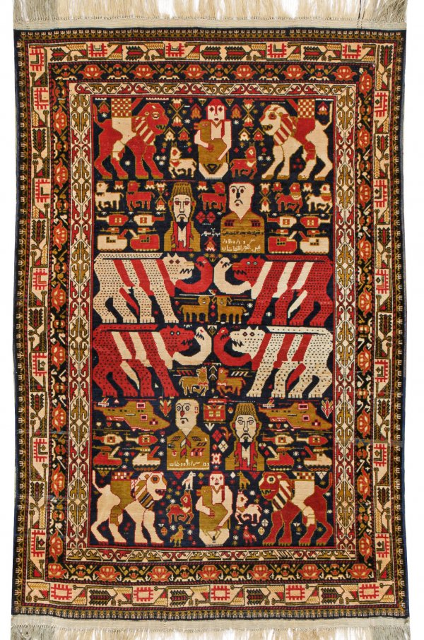 Brücke Afghanistan. Wolle auf Wolle. Auf dunklem Fond flächendeckende Musterung aus großen unterschiedlichen Tiermotiven stilisierten Portraits Hubschraubern und Panzern. Umlaufend mehrteilige Bordüre. 96 cm x 148 cm.