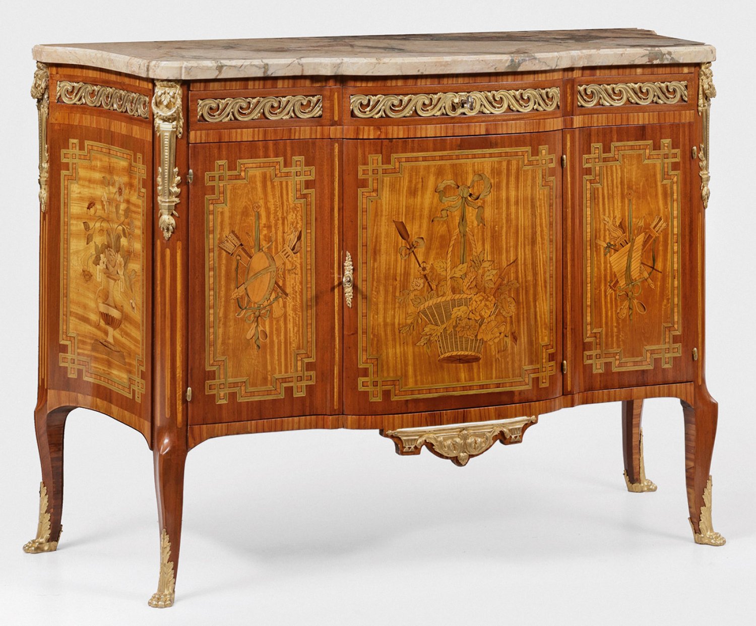 Große Louis XVI-Anrichte Mahagoni und Satinholz furniert sowie Einlagen aus Rosenholz und teilw. grün gefärbtem Ahorn. Applikationen aus vergoldeter Bronze. Querrechteckig angelegter seitlich leicht ausschwingender Korpus flankiert von gerundeten Ecklisenen auf geschwungenen Beinen. In der gegliederten Front zwei teilw. bombierte bzw. faltbare Türen unterschiedlicher Größe mit intarsierten Attributen der Musik sowie oberhalb breites Schubfach mit Wellenbandfries. Seitlich intarsierte Vasenmotive. Flächendeckende Furnierfelder von Bandeinlagen begrenzt. Deckplatte aus cremefarbenem rotbraun und grau gemasertem Marmor. H. 100 cm. 138 cm x 57 cm.