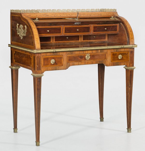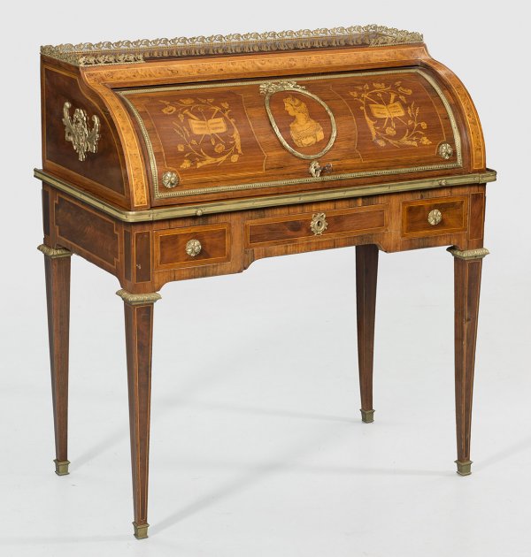 Louis XVI- Zylinderbureau Mahagoni und Palisander furniert sowie Einlagen aus unterschiedlichen Edelhölzern. Gerader dreischübiger Zargenkasten auf hohen konischen Beinen. Oberhalb ausziehbare Arbeitsfläche mit bombiertem Zylinderverschluss. Dahinter gestaffelte Facheinteilung. Durchbrochen gearbeitete Galerierahmung. Schauseitig breit gerahmte Furnierfelder sowie intarsierte Attribute der Musik. H. 104 cm. 95 cm x 52 cm.