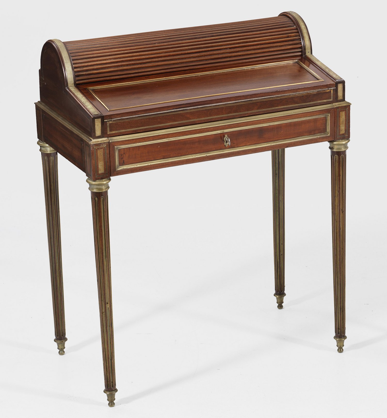 Kleiner Louis XVI-Sekretär Mahagoni furniert. Gerader einschübiger Zargenkasten auf hohen kannelierten Beinen. Schräggestellte abklappbare Schreibplatte mit eingelegter Arbeitsfläche sowie Rolloverschluss mit Facheinteilung. H. 87 cm. 69 cm x 41 cm.
