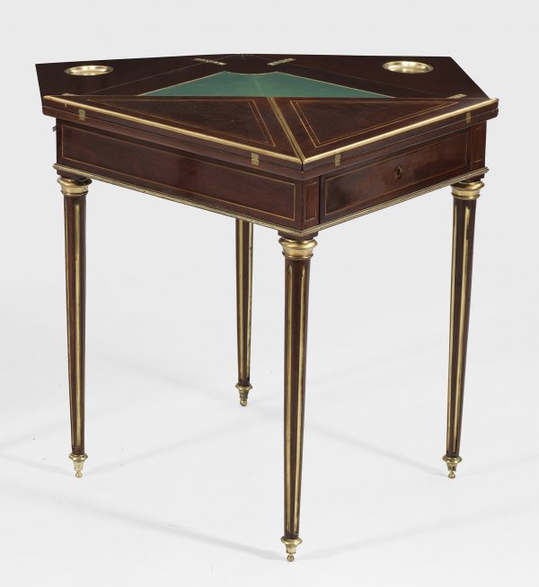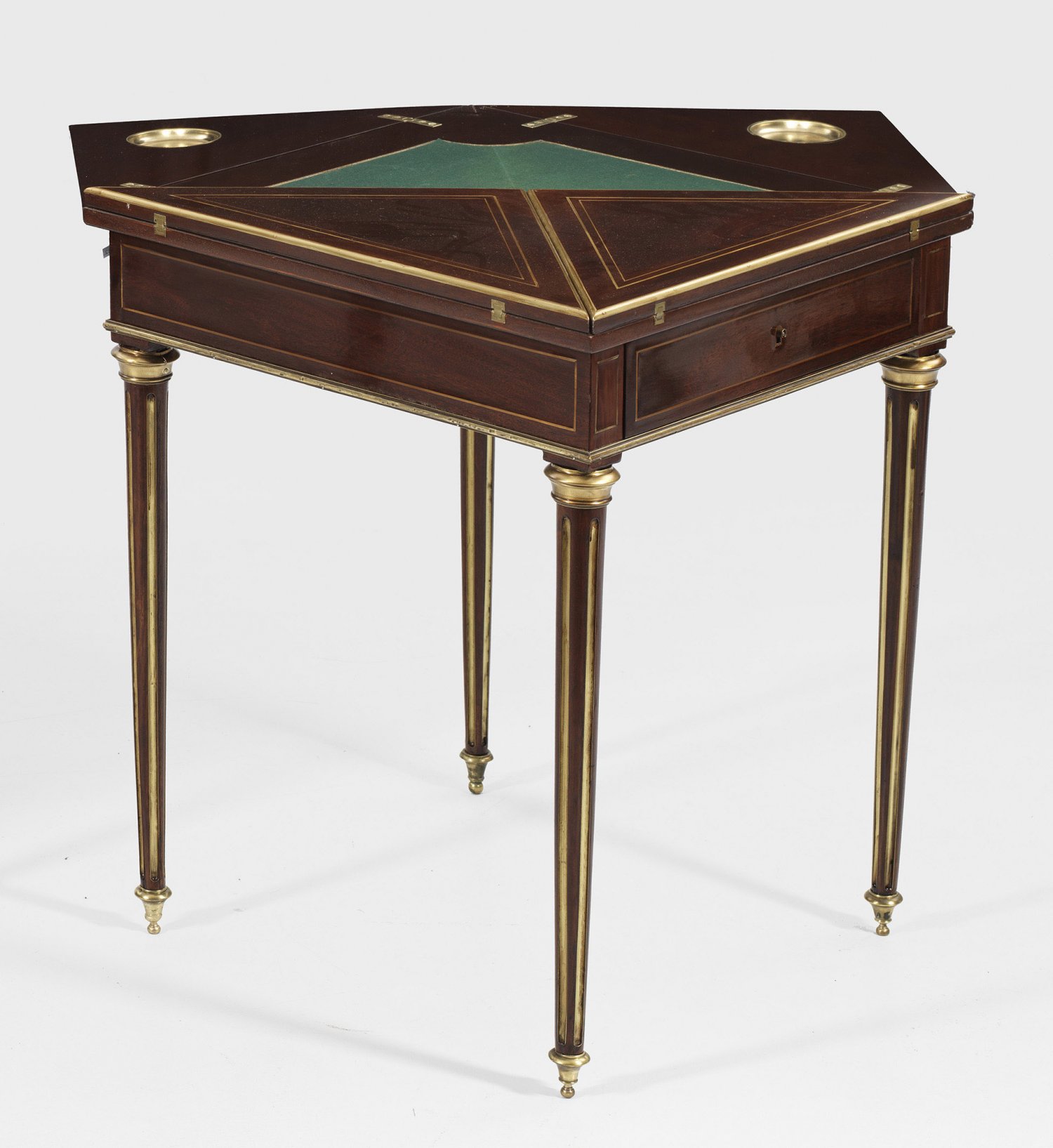 Louis XVI-Spieltisch Mahagoni furniert sowie Profile aus Messing. Gerade Zarge auf hohen kannelierten Beinen. Gering überstehende drehbare aufklappbare Deckplatte mit grüner Spielfläche und Messingschalen für Jetons. H. 77 cm. 59 cm x 59 cm bzw. 83 cm x 83 cm.