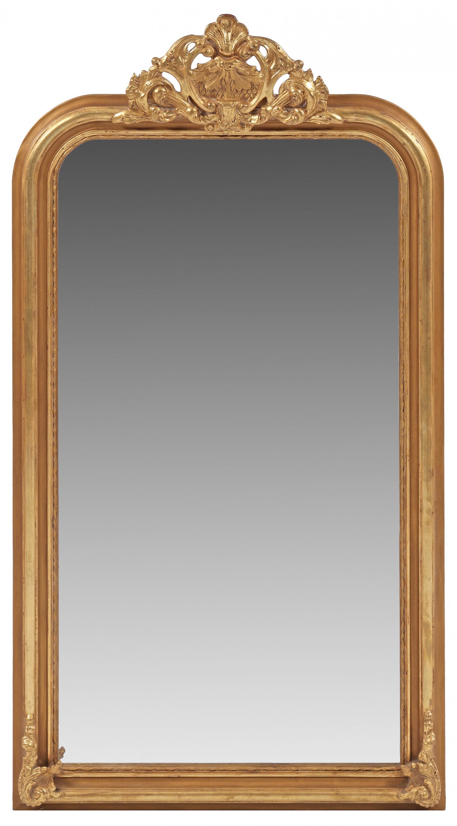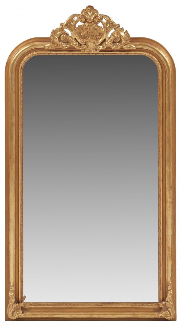 Großer Wandspiegel Holz stuckiert und goldfarben gefasst. Hochrechteckige profilierte Spiegelrahmung mit schmalem Fries aus stilisierten Blattvoluten und gewölbtem oberen Abschluss. Hohe durchbrochen gearbeitete Bekrönung aus zentraler Blattkartusche flankiert von eingerollten Voluten. Facettiertes Spiegelglas. 168 cm x 90 cm.