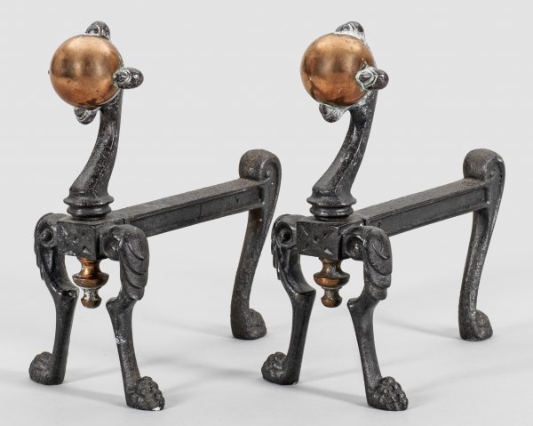 Paar Kaminböcke Gusseisen und Kupfer. Über gegeneinander gestellten Voluten mit stilisierten Tatzenfüßen gebogte Strebe mit großer Kralle ein Kugelelement haltend. Gekantete Auflage. H. 26 cm.