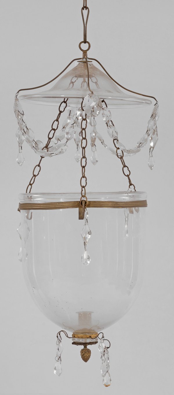 Empire-Deckenampel 1-flg.; Messing und farbloses Glas. Zylinderförmiger Korpus mit gewölbtem unteren Abschluss als Träger für Leuchtmittel. Oberhalb davon ausgehend schmale Kettenglieder sowie oberer Abschluss in Form einer flachen Kuppel mit Prismenbehang. H. 59 cm. D. 22 cm.