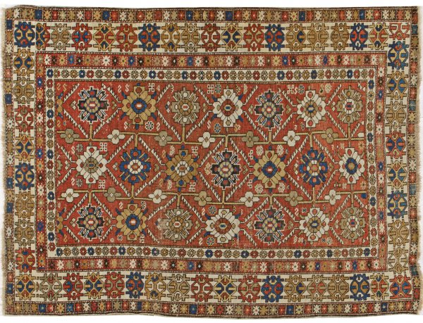Antike Kasak-Brücke Kaukasus. Um 1920. Wolle auf Wolle. Im rotbraunen Innenfeld flächendeckende Musterung aus Blütenrosetten und Zackenbändern im Rapport. Umlaufend breite mehrteilige Bordüre aus unterschiedlichen Bändern mit Blütenrosetten. 114 cm x 159 cm