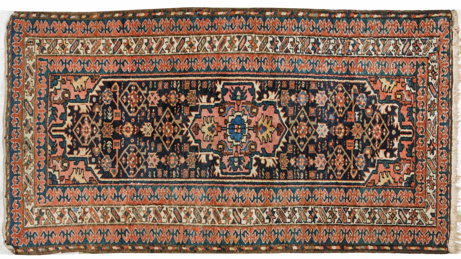 Hamadan-Brücke Persien. Wolle auf Baumwolle. Im dunklen Innenfeld roséfarbenes Zentralmedaillon und korrespondierende Ecklösungen sowie flächendeckende Musterung aus Rosetten. Umlaufend mehrteilige Ornamentbordüre. 115 cm x 214 cm.