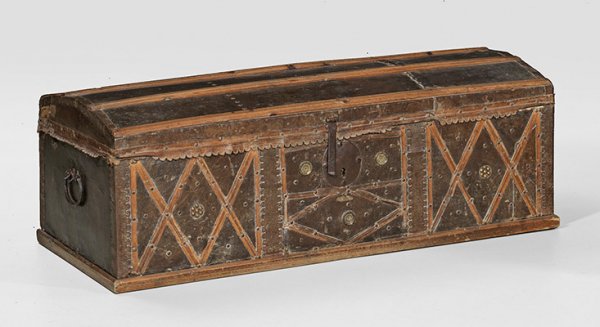 Koffertruhe Holz schauseitig bespannt mit dunkelbraunem Leder. Gerader querrechteckig angelegter Korpus mit seitlichen Handhaben. Flach gewölbter Runddeckel mit quer angebrachten Streben. Metallverstärkte Ecken sowie in der Front gitterartig angelegter Dekor. Innen- und Rückseite mit jüngerer Stoffauskleidung. Kein Schlüssel. H. 38 cm. 109 cm x 48 cm.