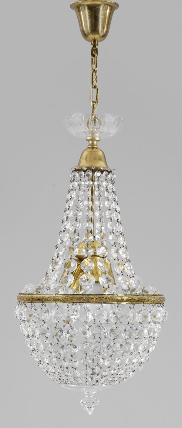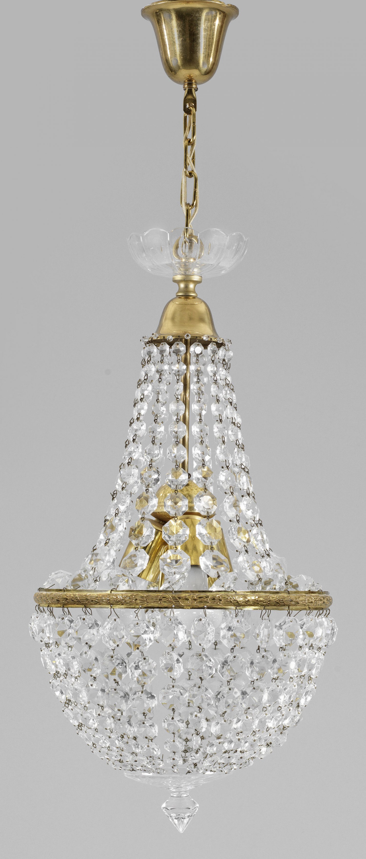 Kleiner Deckenlüster Messing vergoldet und farbloses Glas. Balusterförmiger Korpus aus Prismenschnüren im Verlauf. In der Mitte schmaler ornamentierter Reif. Kurze Kettenaufhängung. Innen drei Lampenfassungen. Elektrifiziert. Lampen-H. 58 cm. D. 30 cm.