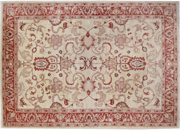 Großer Teppich mit Ziegler-Muster Wolle auf Baumwolle. Im cremefarbenen Innenfeld flächendeckend großzügig angelegte Musterung aus Palmettenranken in unterschiedlichen Rottönen. Umlaufend breite Bordüre mit korrespondierendem Muster in Rot- und Rosétönen. 313 cm x 230 cm.