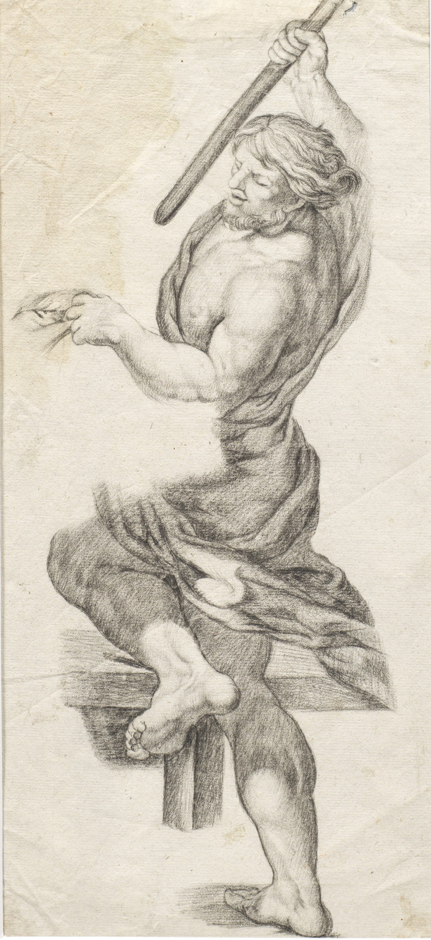 Ausschnitthaft komponierte Figurenstudie eines vollbärtigen, nur mit einem umgelegten Tuch bekleideten Mannes. Dieser stützt sich mit seinen Beinen an eine Bank, während er mit seinem Oberkörper eine Gegenbewegung ausführt und mit seiner linken Hand den Gewandzipfel einer weiteren verdeckt bleibenden Figur packt sowie mit einem längeren Stock in der rechten, erhobenen Hand zum Schlag ausholt. Durch die hochformatige Komposition wird die Dynamik der Figur gesteigert und durch effektvolle Schattierungen zugleich die gleichsam plastische, dreidimensionale Wirkung verstärkt. Das Blatt dürfte als Studie für Gemälde mit biblischen oder mythologischen Motiven entstanden sein, wobei sich der Künstler intensiv mit der aus dem Manierismus tradierten Drehbewegung der "figura serpentinata" auseinandersetzte. Schwarze Kreide/Papier. Ca. 29 cm x 13,5 cm (Passepartoutausschnitt).