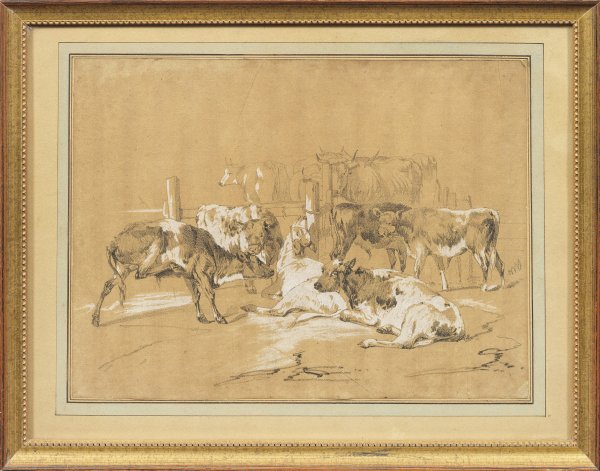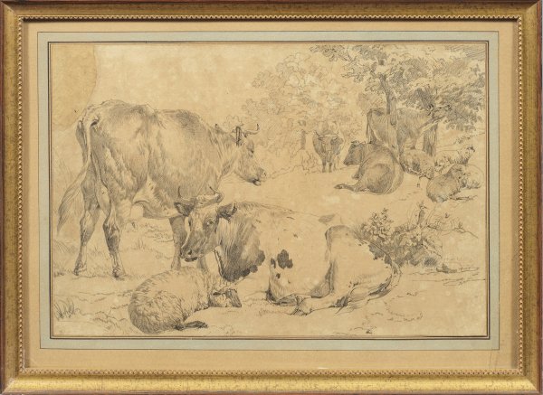 Lebendig geschilderte Rinder und Schafe in Landschaft bzw. an einem Gatter. Bleistift, teilw. mit Weißhöhungen/Papier. Ein Blatt auf dem Rückenkarton bez. "Berghem". Gebräunt, ein Blatt l. o. rest.; Ca. 28 cm-29 cm x 38 cm-43 cm. Rahmen.