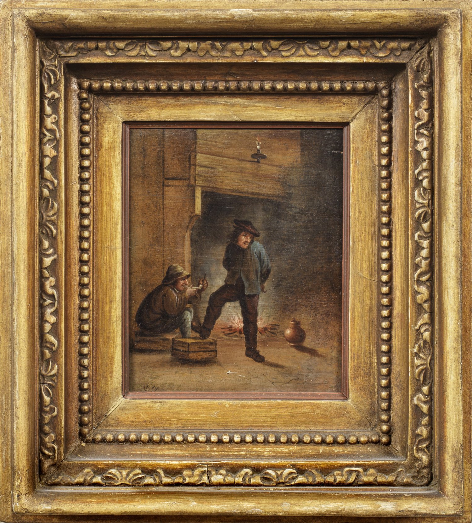 Kleinformatiges Bauern-Interieurbild in der Nachfolge von David Teniers, Adriaen Brouwer und Adriaen van Ostade. Öl/Eichenholzafel. L. u. undeutl. monogr:, 15,8 cm x 13 cm. Rahmen.