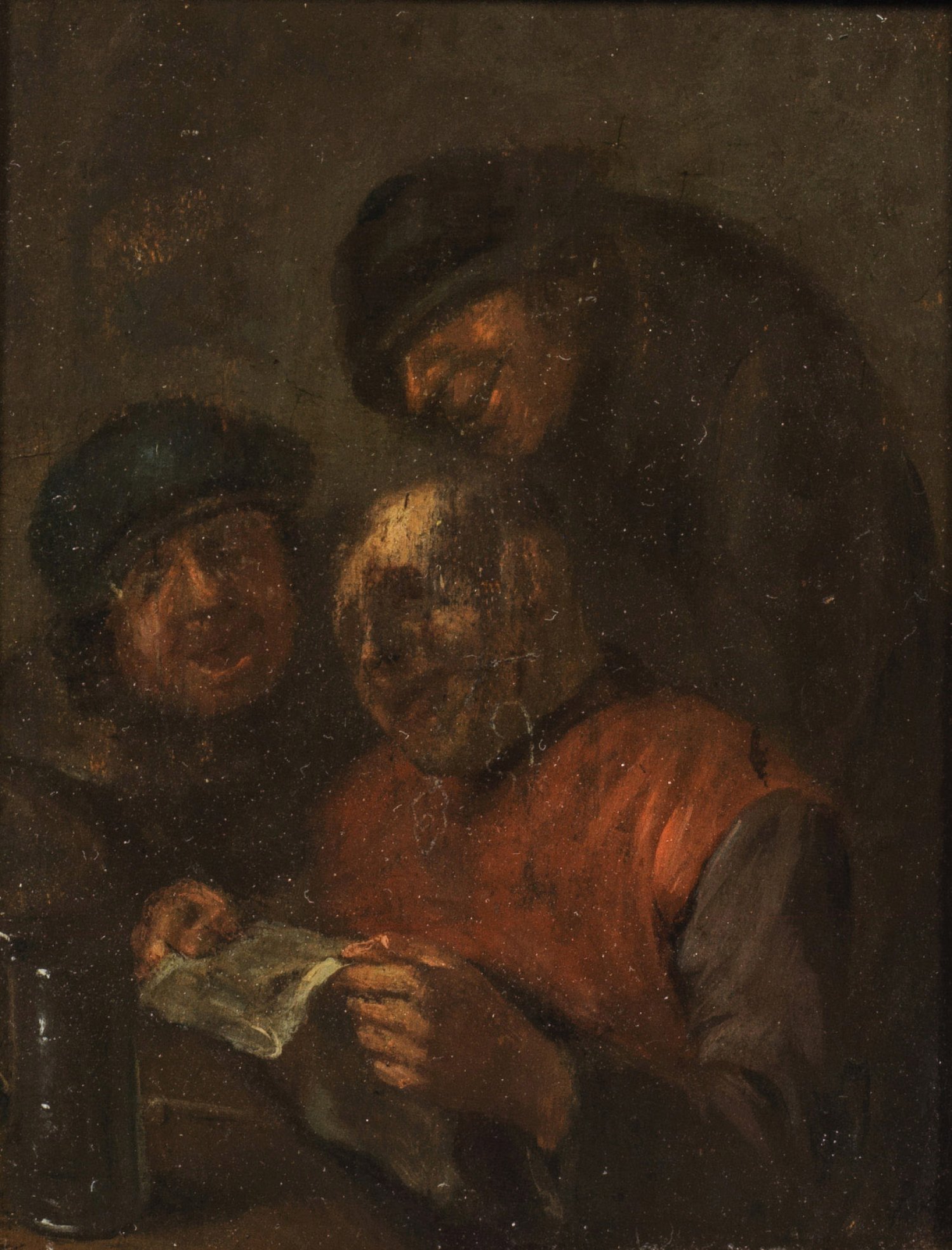Fein lasierend gemaltes Kabinettbild. Die gleichsam satirisch überzeichnete Darstellung grobschlächtig geschilderter, oft bäuerischer Figuren beim Lesen sind ein wiederkehrendes Motiv im Oeuvre Ostades, wobei er die Komposition bevorzugt auf die Haupfigur selbst oder wenige weitere Figuren konzentrierte. Öl/Holztafel. Ca. 13,5 cm x 10 cm. Rahmen.