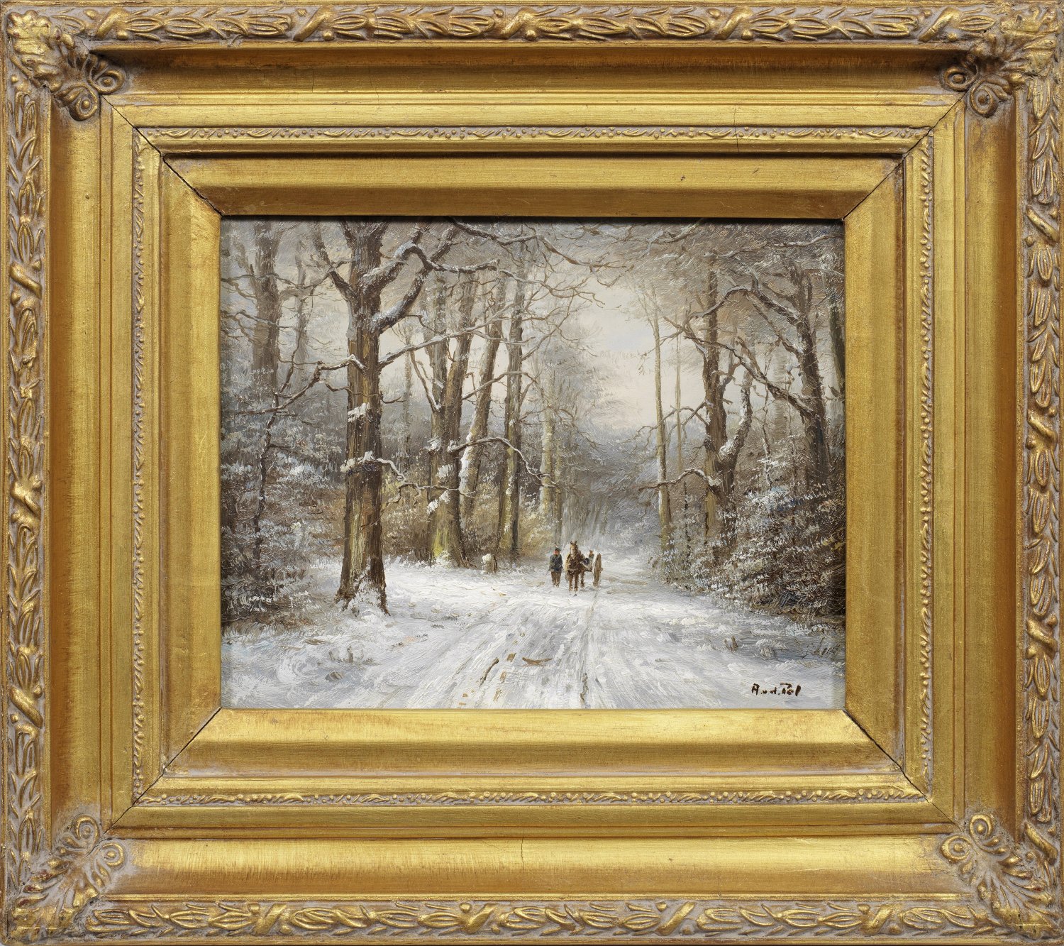 Pferdekarren auf einem winterlich verschneiten Waldweg