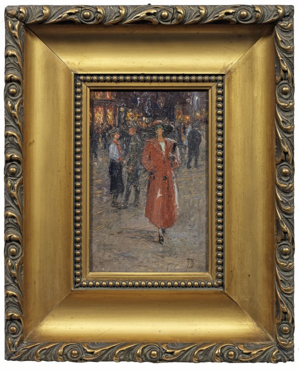 Mit pastosem Duktus gemalte, impressionistische Szene mit flanierender, eleganter Dame beim Kröpcke in Hannover. Öl/Malkarton. R. u. sign. u. dat. 1923. Verso vom Künstler bez. mit Adresse sowie bez./betitelt "Hannover 'Georgstraße' bei Kröpcke[sic!] Ölgem.". 31 cm x 21 cm. Rahmen.
