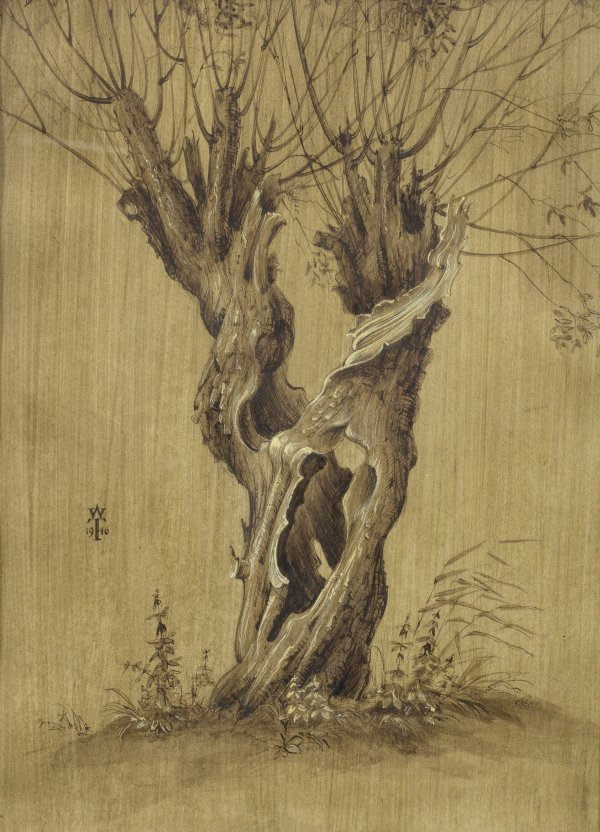 Pinsel- und Federzeichnung in Grisaille/Papier. Dekoratives Blatt im Stil von Albrecht Altdorfer. Am linken Bildrand Ligatur-Monogr. mit Dat. 1946. 34 cm x 26 cm (Passepartoutausschnitt). Rahmen.