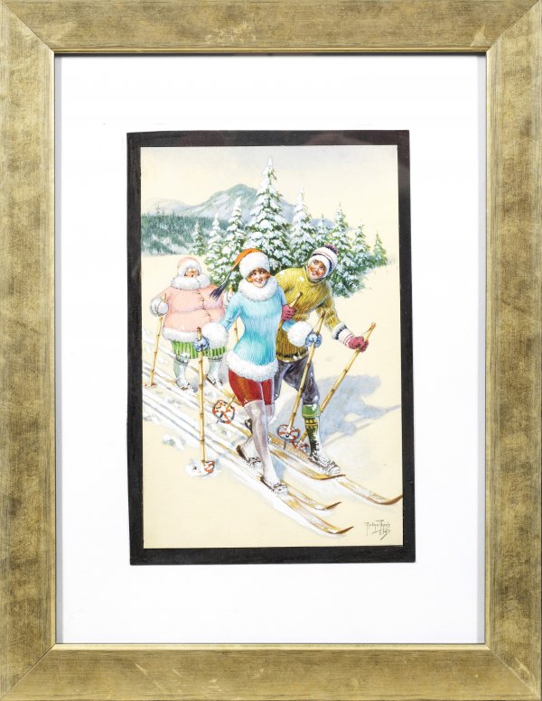 Seltener Originalentwurf für eine Postkarte, erschienen bei A. Weber & Co., Graphische Kunst- und Verlagsanstalt, Stuttgart. Der Maler und Zeichner war ein gefragter Illustrator und Schöpfer von Postkarten, die in seinem Oeuvre einen bedeutenden Raum einnehmen und oft humorvolle Darstellungen zeigen. Aquarell u. Gouache mit Weißhöhungen. R. u. sign.; Verso Atelier-Stempel des Künstlers und Verleger-Stempel. Blatt ca. 28,5 cm x 19 cm. Rahmen.