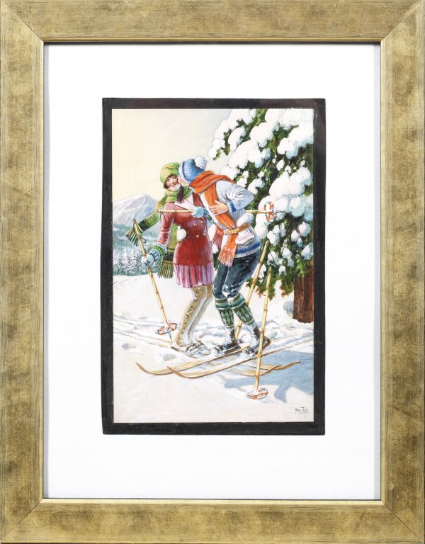 Seltener Originalentwurf für eine Postkarte, erschienen bei A. Weber & Co., Graphische Kunst- und Verlagsanstalt, Stuttgart. Der Maler und Zeichner war ein gefragter Illustrator und Schöpfer von Postkarten, die in seinem Oeuvre einen bedeutenden Raum einnehmen und oft humorvolle Darstellungen zeigen. Aquarell u. Gouache mit Weißhöhungen. R. u. sign.; Verso Atelier-Stempel des Künstlers und Verleger-Stempel. Blatt ca. 28,5 cm x 19 cm. Rahmen.