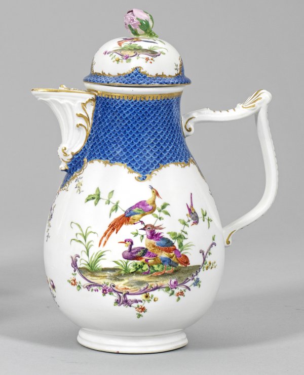 Kaffeekanne mit Vogeldekor Birnförmiger Korpus mit rocaillereliefiertem Schnabelausguss und J-Henkel. Auf aufgewölbtem Deckel plastischer Rosenknauf. Beidseitig der Wandung und auf dem Deckel farbenprächtige, auf Ästen eines Strauches sitzende Vögel, umgeben von Streublumen. Umlaufend blauer, von Goldrocaillen gerahmter Schuppenmosaikrand. Im Boden Ausst.-Etikett. Rest.; Schwertermarke. H. 23 cm.