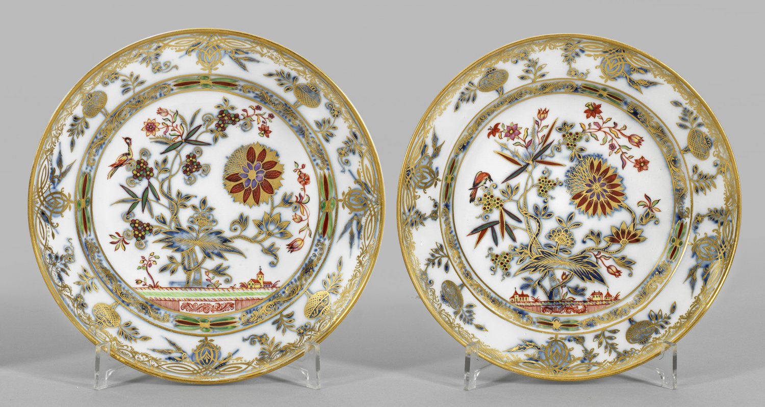 Runde, leicht vertiefte Form mit glattem Rand. Im Spiegel und auf der ansteigenden Fahne Zwiebelmusterdekor, überdekoriert mit Blumen und Vogelmotiven sowie Ornamentik, wohl von der Hausmaler-Werkstatt von F. J. Ferner. Unterglasurblaue, polychrome und Goldmalerei. Ein Teller am Stand best.; Schwertermarke. D. 23,5 cm - 24 cm.