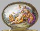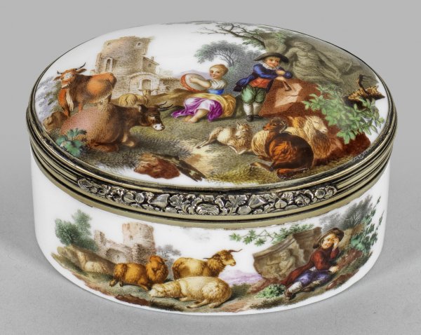 Tabatiere mit Schäfer- und mythologischer Szene Porzellan. Ovaler Korpus mit gewölbtem Scharnierdeckel. Allseitige Schäferszenen in architekturbestandener Landschaft wohl nach François Boucher. Allseitige Darstellungen von jungen Schäfern bei der Rast bzw. beim Musizieren mit Flöte und Tamburin umgeben von Kühen und Schafen in naturalistischer architekturbestandener Landschaft mit Ruinenkulisse. Auf der Unterseite korrespondierende Darstellung mit weidendem Vieh. Im Innendeckel mythologische Darstellung eines die Flöte spielenden Pans in Begleitung von Mänaden beim Musizieren. Äußerst feine polychrome Malerei. Profilierte vergoldete Silbermontierung mit fein gearbeitetem Feston als Daumenrast (später). Gest. Beschaumarken London Jahresbuchstabe Meister John Linnit (tätig 1824 - 1828). H. 4 5 cm. 9 cm x 7 cm.