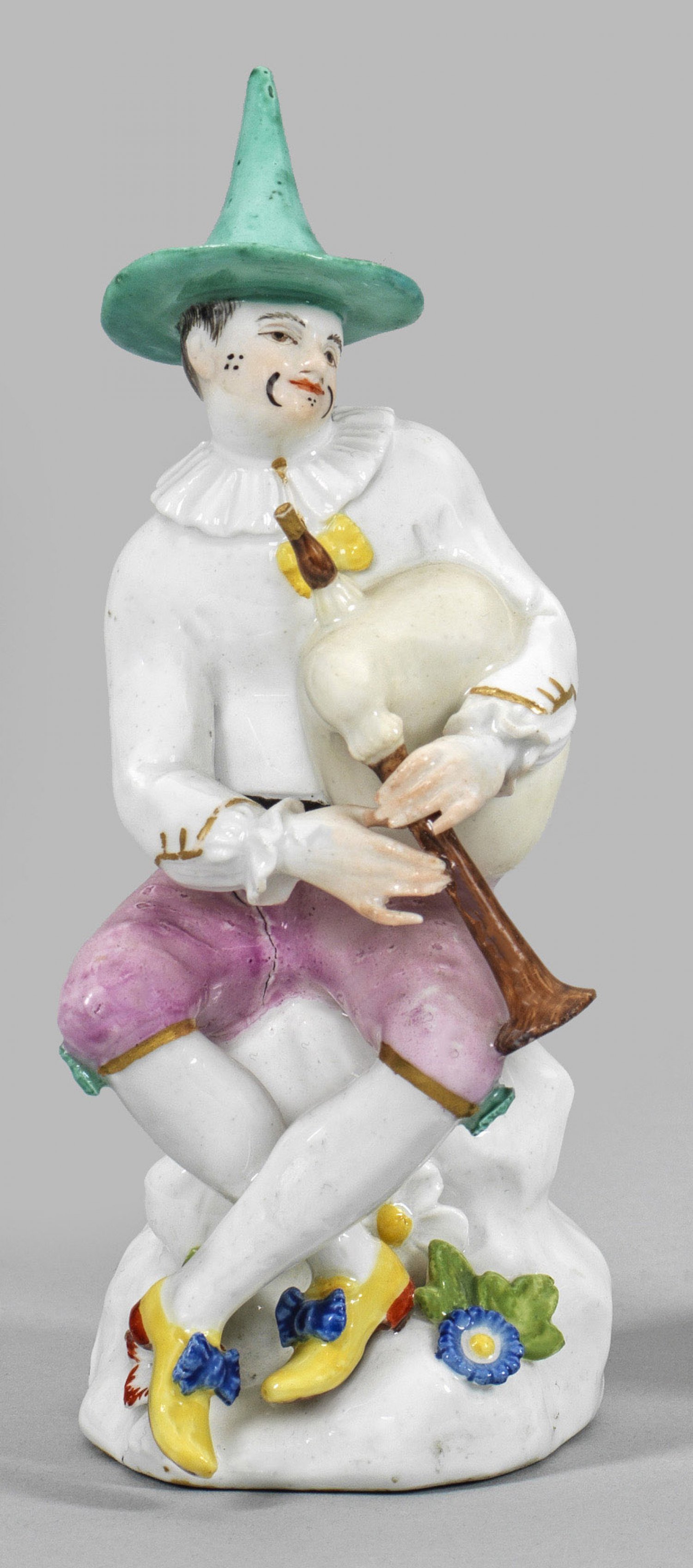 Harlekin mit Dudelsack aus der Italienischen Komödie Auf einem Felssockel sitzender Harlekin in rosafarbener Kniebundhose, weißer Jacke mit Spitzenkragen sowie seegrünem Spitzhut und gelben Schuhen, unter seinem linken Arm einen Dudelsack haltend. Polychrome Malerei mit dezenter Goldkonturierung. Entw. Johann Joachim Kaendler. Minim. best.; Brandriss. Schwertermarke. H. 14,5 cm.
