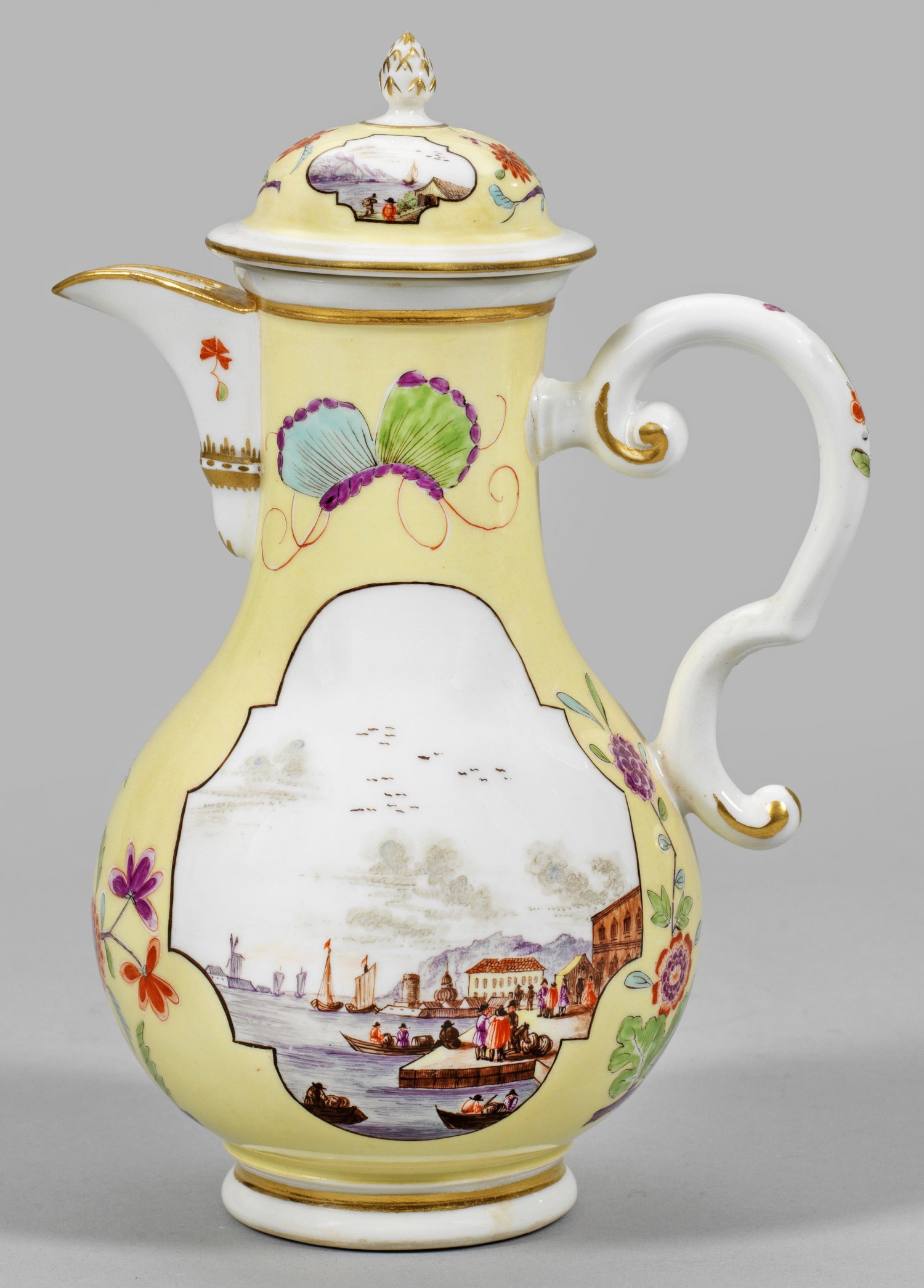 Über rundem Fußring kugeliger Korpus, in schmalen Hals mit profiliertem Rand übergehend. Seitlich geschweifter Volutenhenkel und schnabelförmiger Ausguss sowie aufgewölbter Deckel mit Pinienknauf. Auf der Wandung und im Deckel in zartgelbem Fond ausgesparte, braun konturierte Reserven mit Kauffahrteidekor. Architekturbestandene, figurenreiche Hafenszenen mit Segelschiffen und Kaufleuten beim Verhandeln. Umlaufend feiner Kakiemondekor aus aufsteigenden, blühenden Chrysanthemen- und Päonienzweigen sowie Schmetterlingen. Äußerst feine polychrome sowie goldgehöhte, teilw. schwarz konturierte Kakiemonmalerei in See- und Moosgrün, Eisenrot und Purpur. Dreherzeichen 11. Goldstaffage. Schwertermarke. H. 20 cm.