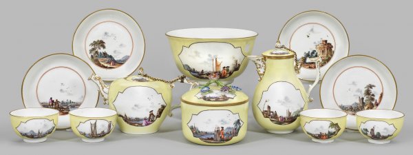 8-tlg.; Kaffee-, Teekanne, Zuckerdose, Spülkumme, 4 Koppchen mit Unterschalen. Kannen mit reliefierten J-Henkeln, Schnabel- bzw. Tierkopfausguss. Deckel mit Pinienknauf bzw. plastisch aufgelegtem Blütenzweig. Auf der Wandung und dem Deckel in zartgelbem Fond ausgesparte, schwarz konturierte Reserven mit Landschafts- und Kauffahrteidekor. Vor imposanter, architekturbestandener Landschafts- und Dorfkulisse figurenreiche, szenische Darstellungen mit galanten Watteaupaaren bzw. der Landbevölkerung, weiterhin Jagd- bzw. Hafenszenerien mit Segelbooten und Kaufleuten. Im Spiegel Medaillonrahmungen aus eisenroten Ringlinien mit korrespondierenden Darstellungen. Äußerst feine polychrome Malerei, wohl von Johann Georg Heintze (tätig in Meissen 1720 - 1749). Reiche Goldstaffage. Im Boden Nr. 6 in Purpur. Schwertermarke. Kannen-H. 11 cm - 16 cm. Kummen-D. 16 cm.