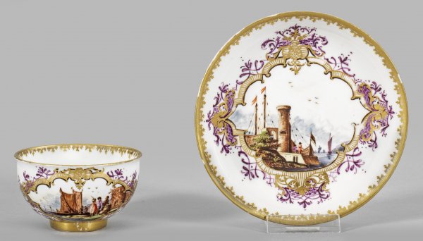 Koppchen mit Kauffahrteiszene auf Unterschale. Leicht gebauchter, sich konisch erweiternder Korpus mit ausschwingendem Rand. Auf der Wandung und im vertieften Spiegel sog. Kauffahrteiszenen mit Segelschiffen, Architektur und Figurenstaffage, gerahmt von Laub- und Bandelwerk in Purpur und Gold. Innen eisenrote Medaillonrahmung mit korrespondierender Darstellung. Feine polychrome Malerei. Umlaufende Goldbehangbordüre am Rand. Minim. ber.; Schwertermarke. H. 4 cm.