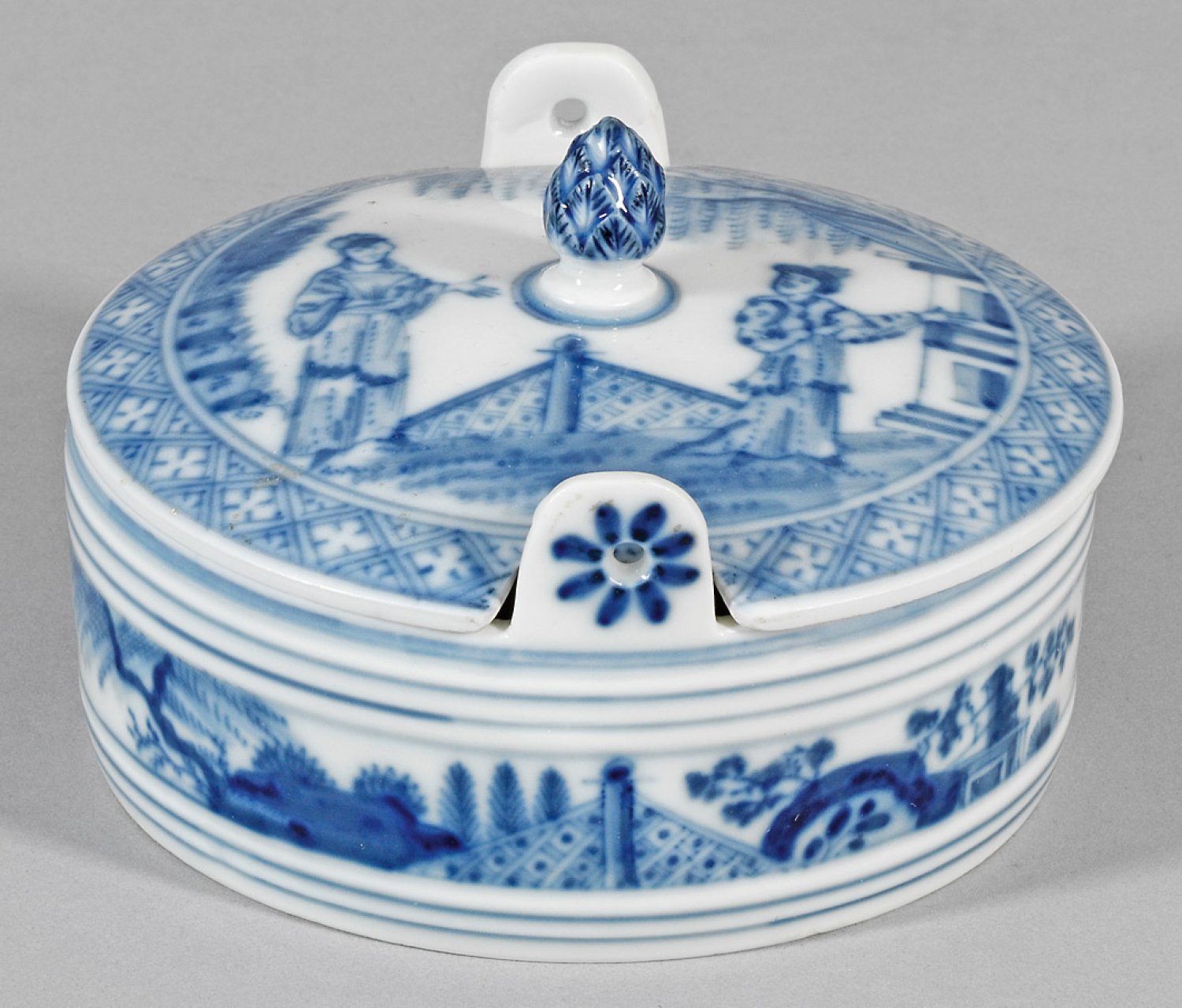 Butterdose mit Chinoiserie Runder Korpus mit zwei hochstehenden gelochten Griffen. Leicht gewölbter Deckel mit Pinienknauf. Reich bemalt mit asiatischen Gartenlandschaften und Personenstaffage in Unterglasurblau. Minim. Haarriss. Schwertermarke. H. 7 cm. D. 10 5 cm.