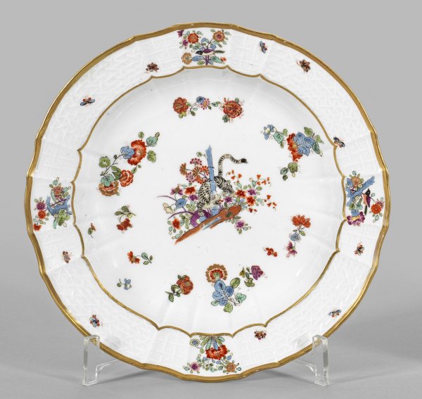 Zierteller mit Dekor "Gelber Löwe" Runde, gemuldete Form mit fassoniertem Rand. Im Spiegel feiner Kakiemondekor nach japanischem Vorbild mit gelbem Löwen (bzw. gestreiftem Tiger), sich um einen blauen Bambusstab windend. Umgeben von Indianischen Blütenzweigen. Auf der Fahne umlaufender Reliefdekor "Alt-Brandenstein" mit Insekten im Wechsel mit Vogelmotiven und Prunuszweigen. Polychrome, teilw. goldgehöhte Malerei. Goldkonturierung. Entw. Johann Friedrich Eberlein. Unw. rest.; Schwertermarke. D. 23,5 cm.