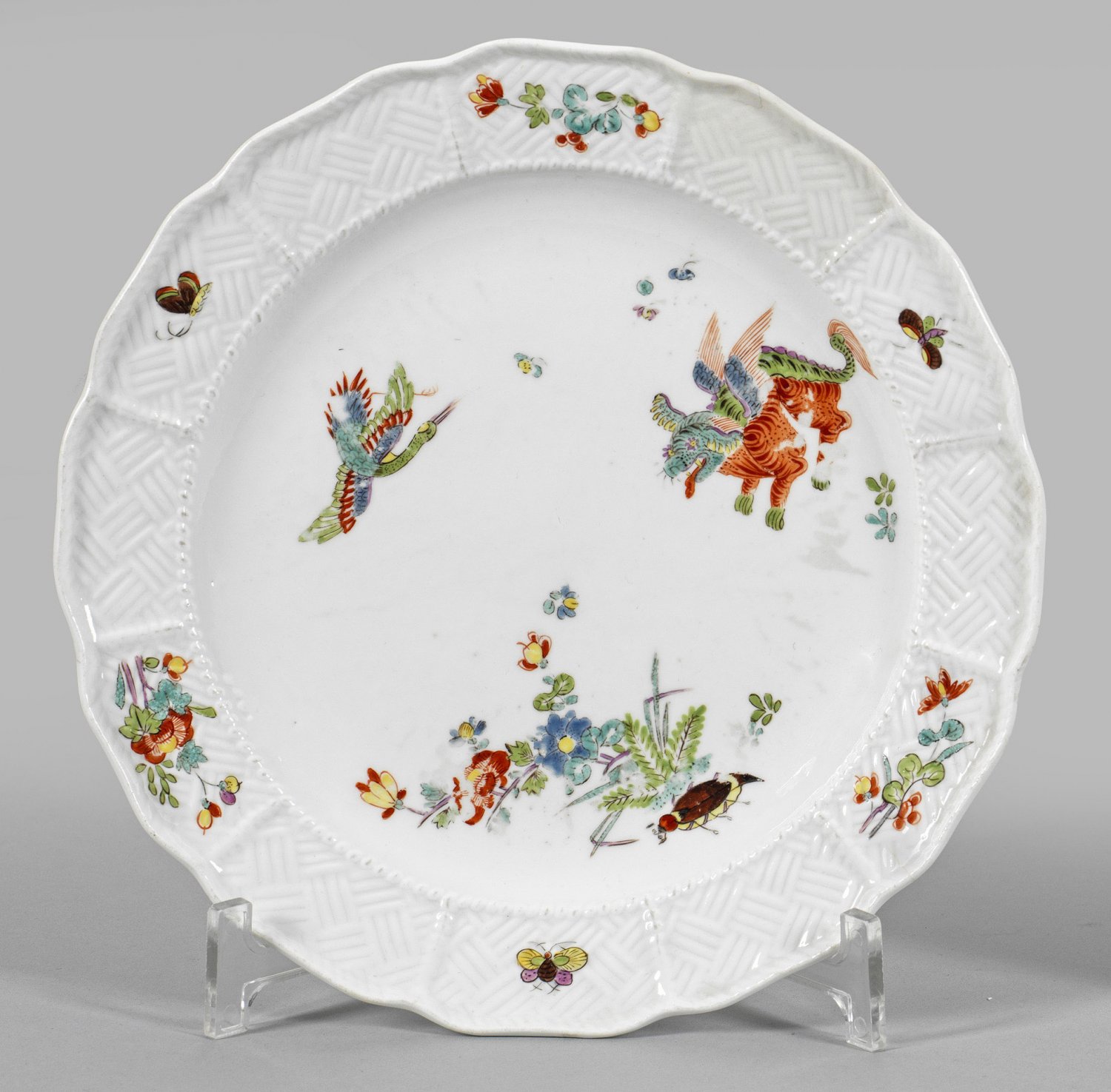 Zierteller mit Dekor "Koreanischer Löwe" Runde Form mit passig geschweiftem Rand. Auf der Fahne Reliefdekor "Sulkowski" mit verschiedenen Blumenzweigen. Im leicht vertieften Spiegel farbenprächtiger Kakiemondekor. Unweit eines Arrangements aus Päonien, Gräsern und Farnen sitzender Maikäfer, oberhalb geflügeltes "Ch'i-lin"-Fabelwesen, sog. Koreanischer Löwe sowie fliegender Reiher. Polychrome Malerei im Kakiemonstil. Minim. rest.; Ber.;Schwertermarke. D. 23 cm.