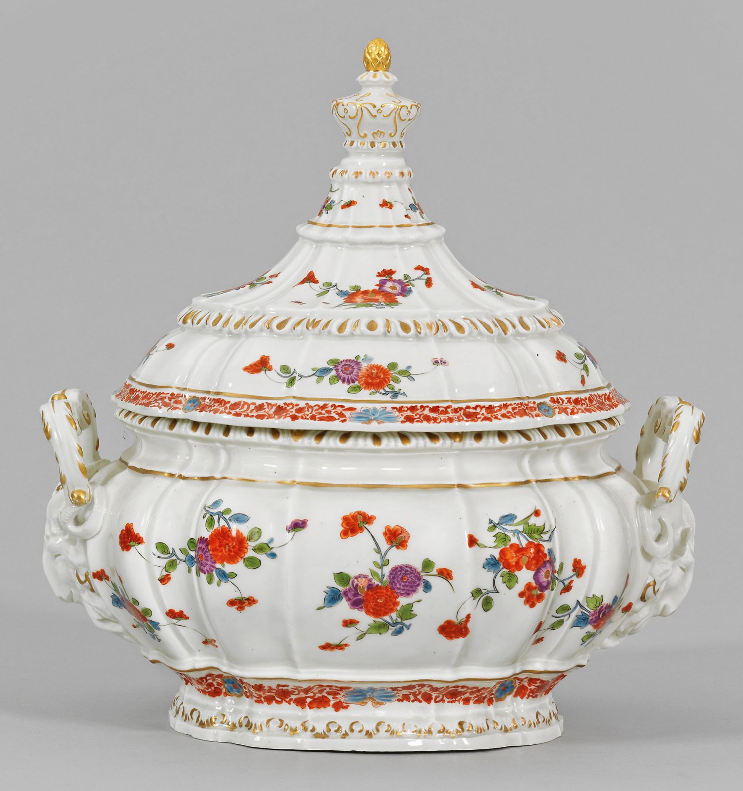 Große Deckelterrine mit Kakiemondekor Reiche, fassonnierte Form, seitlich geschweifter Henkel aus gegenläufigen Voluten, am Ansatz plastische Bocksköpfe. Dem Korpus entsprechend gestalteter Deckel, mittig aufsteigender Kronenknauf. Auf der Wandung sog. Kakiemondekor mit gestreuten Indianischen Blüten. Polychrome Malerei mit Golddekor. Minim. rest.; Entw. Johann Joachim Kaendler. Schwertermarke. H. 34 cm. 31 cm x 22 cm.