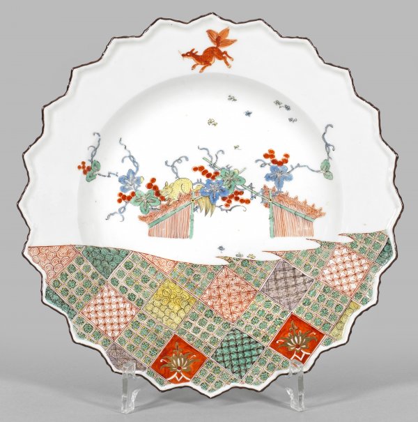Runde, leicht vertiefte Form mit gezacktem und braun staffiertem Rand. Über Spiegel und Fahne angelegter, farbiger Dekor. Im oberen Drittel sog. Kakiemondekor aus fliegendem roten bzw. Beeren naschendem gelben Eichhörnchen, umgeben von Reisstrohbündeln, Bambus und Blattwerk. Im unteren Drittel sog. Schachbrettmuster (bzw. Brokatmuster) im Imari-Stil aus Quadratflächen mit unterschiedlichen Brokatornamenten sowie goldenen Lotusblüten auf rotem Fond. Im Boden eingepresste Dreher-und Former-Nr. 20. Schwertermarke. D. 24,5 cm.