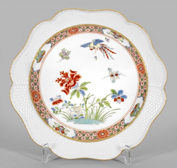 Zierteller mit "Famille verte"-Dekor Runde Form mit geschweiftem Goldrand. "Altozier"-Reliefdekor. Im leicht vertieften Spiegel leuchtend farbiger Dekor im Stil der chinesischen "Famille verte"-Porzellane aus stilisiertem Lotusgewässer mit Blüten, umgeben von blühenden Päonienzweigen, fliegendem Hôô-Vogel (Phönix), Schmetterlingen und Streublumen, gerahmt von breiter Brokatbordüre mit großen Chrysanthemenblüten und farbenprächtigen, in vier passigen Reserven gerahmten Schmetterlingen. Polychrome Malerei im Kakiemonstil in Emailblau, Eisenrot, See- und Moosgrün sowie Gelb und wenig Aubergine. Rest.; Schwertermarke. D. 25 cm.