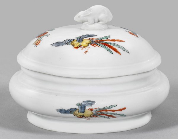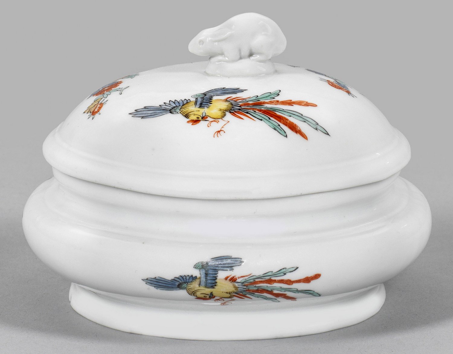 Länglich-ovaler, bombierter Korpus mit profiliertem Rand. Eingelassener, aufgewölbter Deckel, mittig plastischer Knauf in Gestalt eines sitzenden Hasens. Auf der Wandung und dem Deckel farbenprächtiger, fliegender Hôô-Vogel (Fenghuang) mit langgezackten Schwanzfedern, umgeben von blühenden Chrysanthemen- und Päonienzweigen. Polychrome, goldgehöhte Malerei in Eisenrot, Emailblau, Seegrün und Zartgelb mit wenig Schwarz. Eingeritztes Dreherzeichen für Johann Christoph Heße (tätig ab 1732). Im Boden Galerieetikett "Brian Haughton, London". Schwertermarke. H. 8,5 cm. 12 cm x 11 cm.